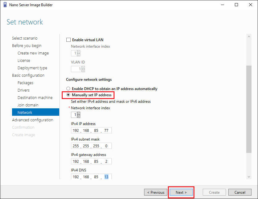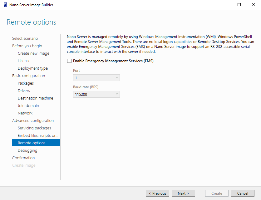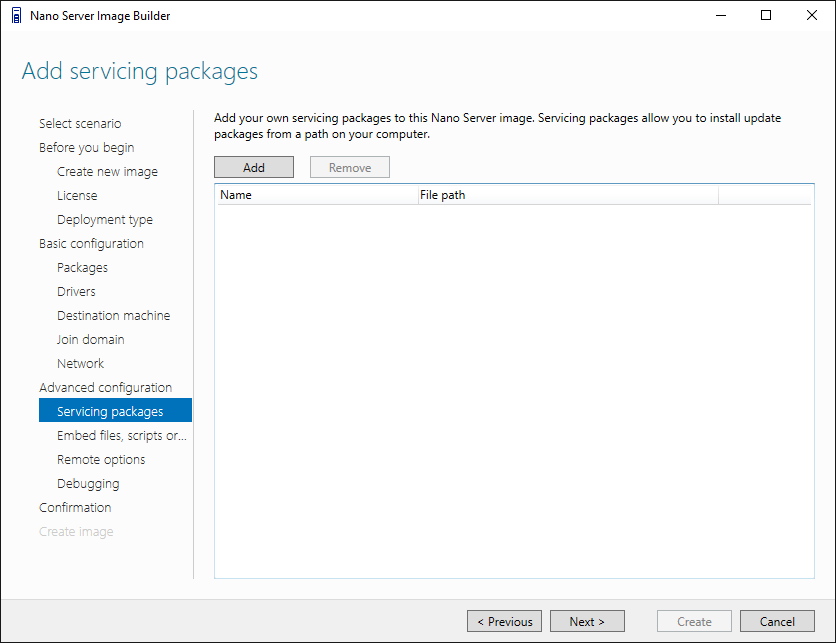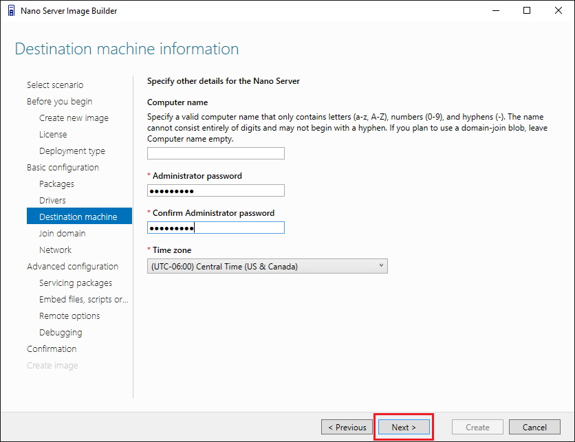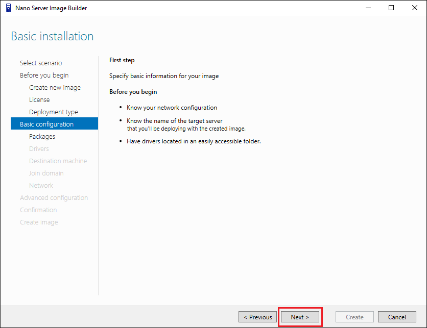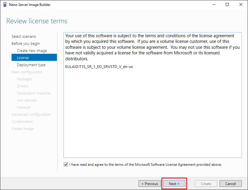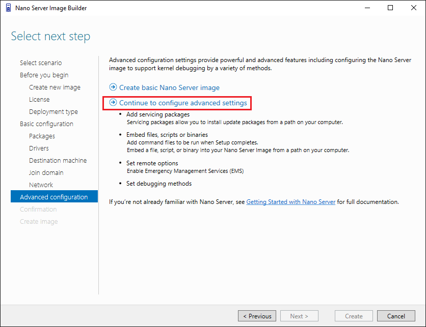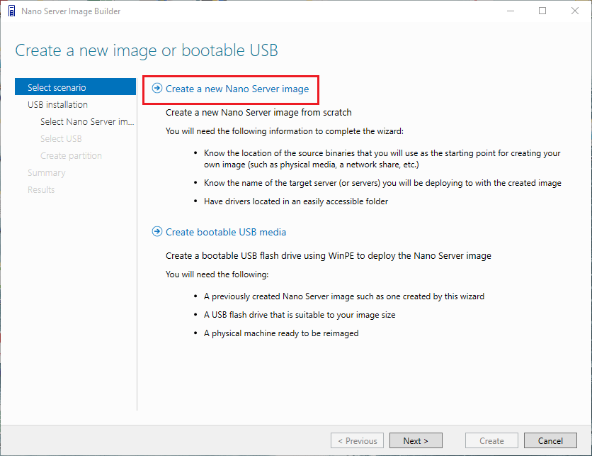 We begin the Nano Server Image Builder by selecting toย Create a new Nano Server image.