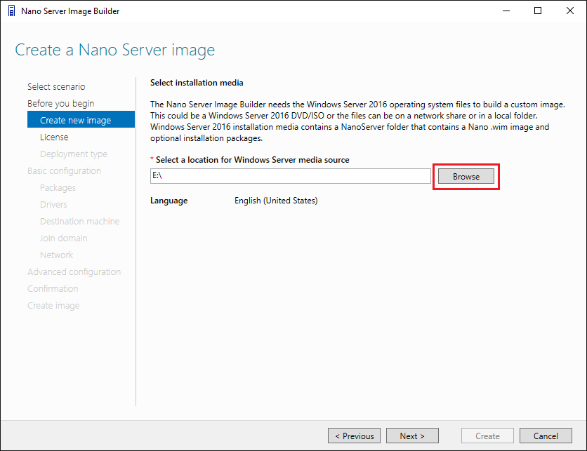 Here we specify the installation media location. ย I have mounted the Windows Server 2016 ISO to my E: drive.