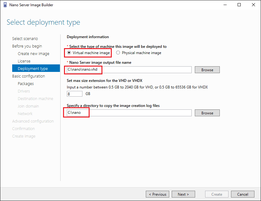 Here we are selecting to create aย Virtual machine image and specify the location for the output files. ย I have created aย c:nano folder on my local hard drive.