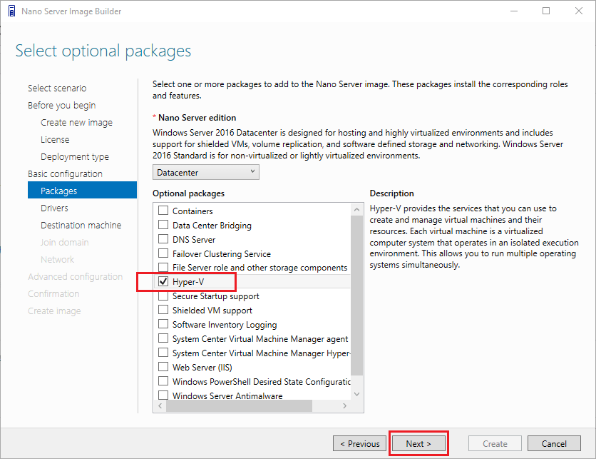 Here we can select the optional packages or roles that we want to include in our Nano Server image. ย I have selectedย Hyper-V.