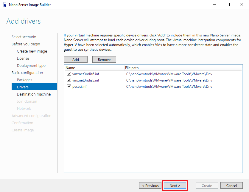 For the purposes of installing this Nano Server image in VMware ESXi, this is a critical step to have device drivers included and found after we provision the VM. ย As you can see below I have included theย vmxnet3 andย pvscsi drivers for network and storage. ย How do we get these drivers?