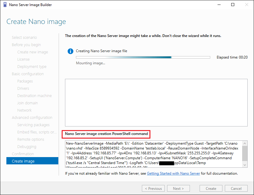 We can then begin the creation process to actually create the image. ย One thing I really like about the Nano Server Image Builder is the utility shows us the Powershell code to perform the operation. ย This is really handy for learning purposes and just to see what the utility is doing under the hood.