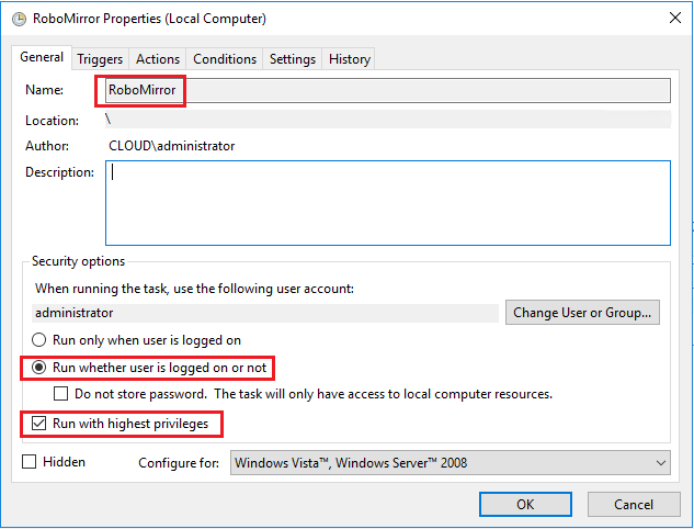 Now to create the Scheduled Task, we can simply create a task that launches our PowerShell file to run the robocopy job as often as we want. ย Be sure to name the task and select toย run whether user is logged on or not as well asย run with highest privileges.