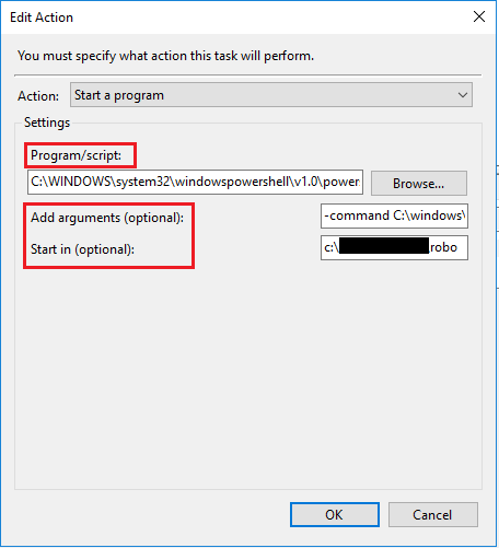 Also, to alleviate issues with scheduled tasks, I always populate theย Start in box with the working directory of the script.