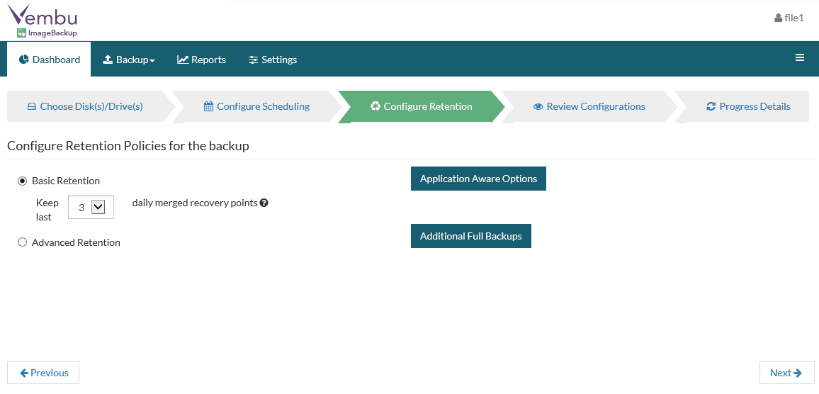 We next select the retention settings we wish to configure along with any application aware configuration and addition GFS settings.