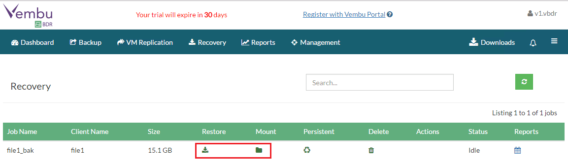 Once the backup is finished, we have access to the restore options as well as mount options within our Vembu BDR server.ย The options for recovery are extremely powerful.