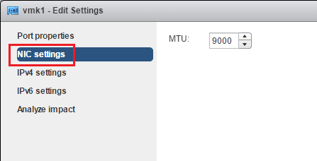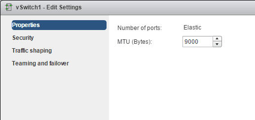 Also, make sure the vSwitch itself is also set for Jumbo frames. Â Click the vSwitch above and the pencil icon above the vSwitch section. Â Here we can set the jumbo frames MTU to 9000.