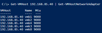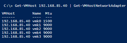 Get-VMHost | Get-VMHostNetworkAdapter | Where { $_.GetType().Name -eq "HostVMKernelVirtualNicImpl" } | Select VMHost, Name, MTU