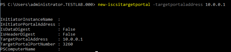 Now with the iSCSI service up and running and configured to start automatically, let’s add our portal address and then we can add our iSCSI targets. ย To add a new target portal address from aย PowerShell command prompt, we run theย new-iscsitargetportal command.