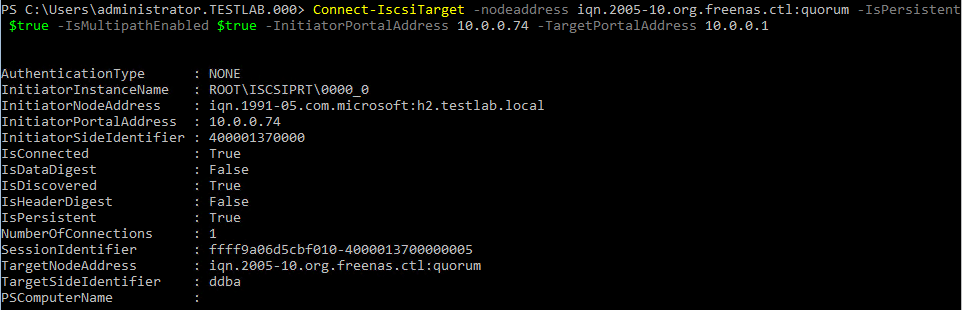 Connect-IscsiTarget -nodeaddress iqn.2005-10.org.freenas.ctl:hvvol1 -IsPersistent $true -IsMultipathEnabled $true -InitiatorPortalAddress <InitiatorIPAddress> -TargetPortalAddress <targetportalIP>
