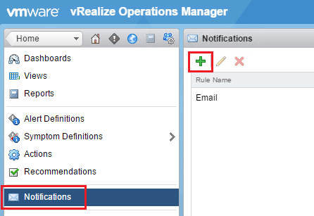 To setup your notifications in general in vROPs, navigate toย Content >> Notifications and click the “+” sign to add a notification profile.