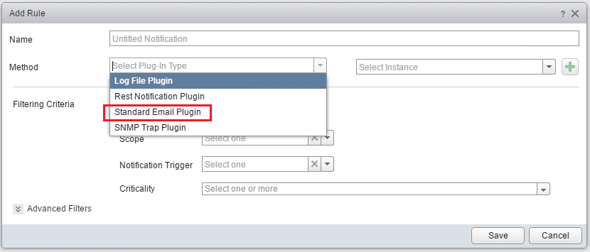 When you click theย plus sign you are taken to theย Add Rule screen. ย If you click the dropdown box inย Method, you choose theย Standard Email Plugin selection.
