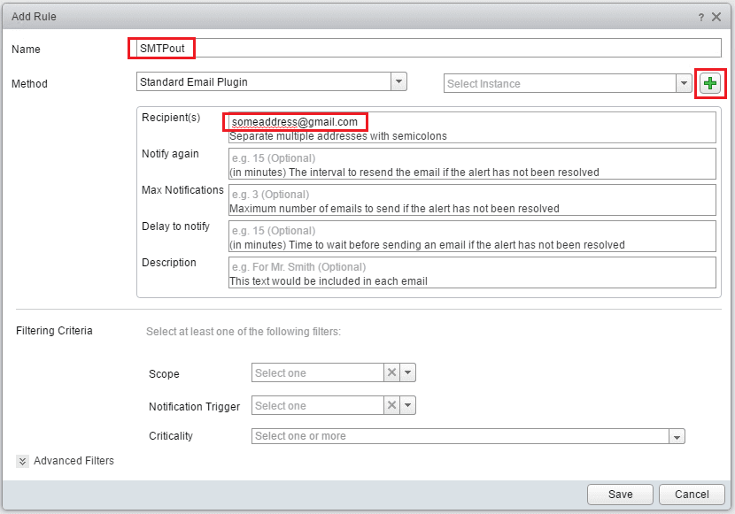 Name the Rule and then in theย Recipientsย field, add yourย Gmail address to the recipients. ย Also, next toย theย Select Instanceย click the green “+” sign.