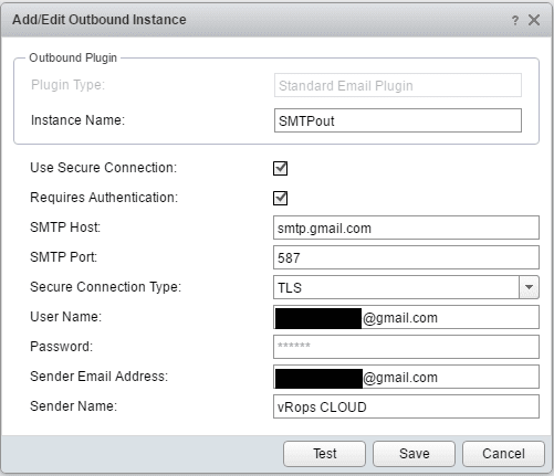 This opens theย Add/Edit Outbound Instances dialog box. ย In the configuration for the instance yourย SMTP Host will beย smtp.gmail.com,ย SMTP Portย will beย 587 andย Secure Connection Typeย should be set toย TLS. ย For Gmail notification to work, you need to set yourย User Name to your full Gmail email address. ย Yourย Password will be your Gmail password. ย A note on the password field, if you have Two-Factor authentication turned on, you will need to generate an app specific password to use for the password here as you won’t be able to use two factor with the vROPs emails.