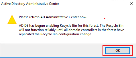 Once you click theย Enable Recycle Bin link, you will see the warning about the gravity of what you are going to do. ย This operation is irreversible, so you can expect to see such a warning. ย However, the AD recycle bin is definitely a worth feature to enable.