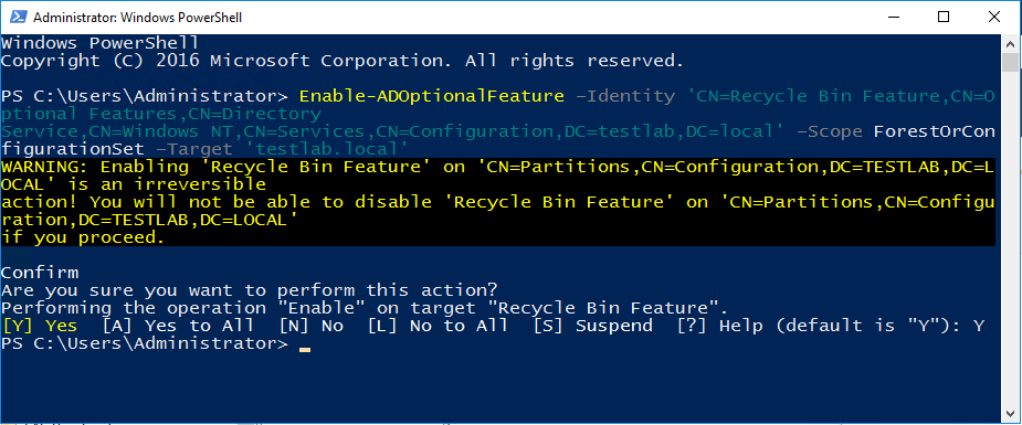 Enable-ADOptionalFeature โIdentity 'CN=Recycle Bin Feature,CN=Optional Features,CN=Directory Service,CN=Windows NT,CN=Services,CN=Configuration,DC=testlab,DC=local' โScope ForestOrConfigurationSet โTarget 'testlab.local'