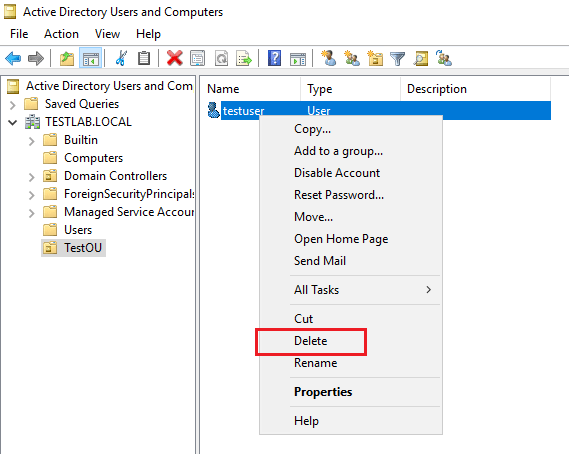 I have created aย testuser account in aย TestOU container. ย Let’s simulate an accidental deletion. ย As you can see, I am about to delete the testuser account.