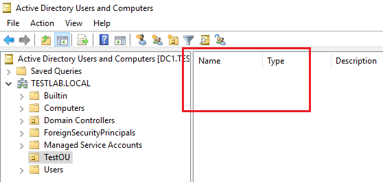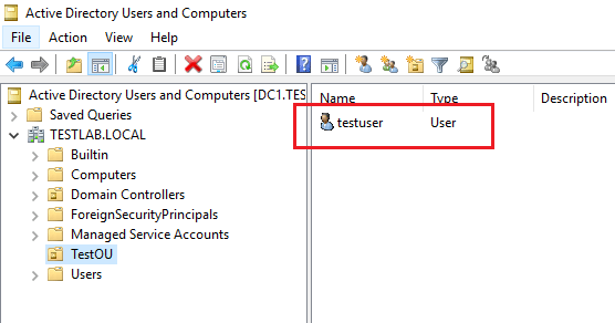 A quick refresh of the ADUC interface once again shows theย testuser object.
