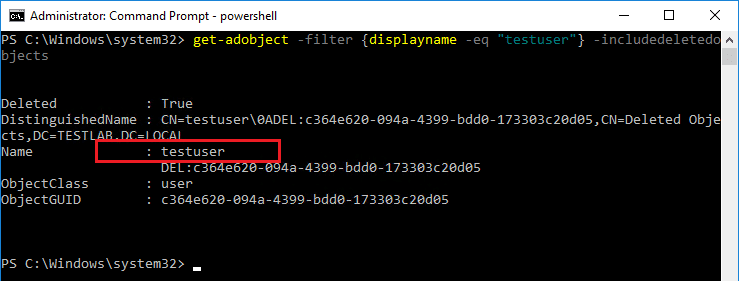 get-adobject -filter {displayname -eq "testuser"} -includedeletedobjects