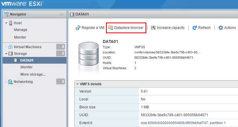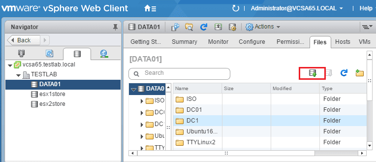 Click your host, then underย Storage, righ click your datastore and chooseย Browse Datastore.