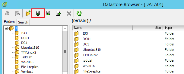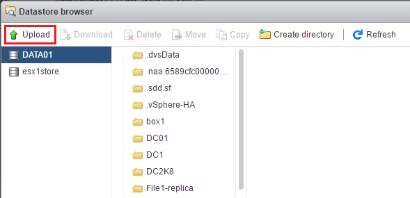 This will open a new window for the Datastore browser. ย Notice theย Upload button. ย Click the Upload button to browse to the file you want to upload. ย Note, whatever folder context you are in is where the file will be uploaded.