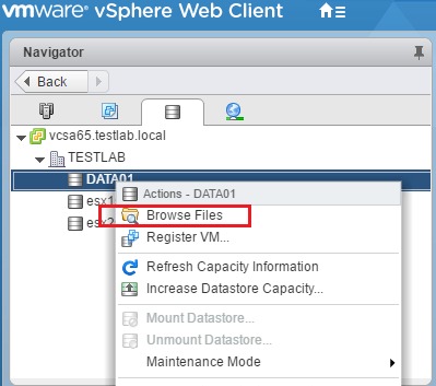Uploading files to your VMware vSphere datastore via vCenter Server is very straightforward and similar to the ESXi host connection. ย You can click on your datastores tab, then right click the datastore you want to upload to. ย Notice you have the context menu pop up where you can selectย Browse Files.