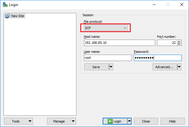 For this option, you can use any SSH client of your choosing. ย Here, I am using WinSCP. ย Also, important to note with this method, you need to have enabled SSH on the ESXi host you want to connect to. ย After doing that, simply choose SCP, enter the IP or hostname of your host, port 22, and your user name and password which by default would be root.