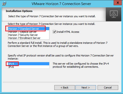 The installation Options screen allows us to choose from several types of installs. Here we will select the Horizon 7 Standard Server. We will go into the other available options in a future post. Also, you can choose to configure either IPv4 or IPv6 for establishing all connections.