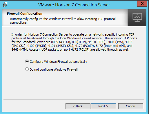 The Connection Server installation will also create all the necessary firewall ports for Windows firewall. The following incoming port allowances include: