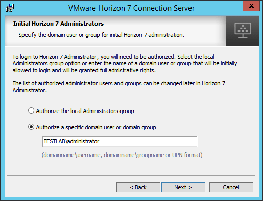 Next, we can specify the Horizon 7 Administrators. For the domain, you can use either a user or a domain group. Best practice here would be to create a specific group for allowing Horizon administration. For the lab, I am simply using the domain admin account.