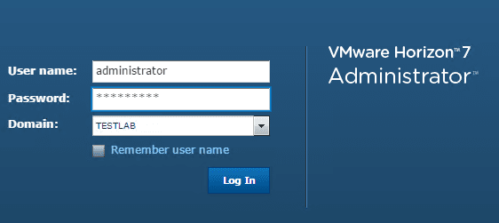 The console login will take you to the VMware Horizon 7 Administrator web console. Here we login with the credential or group member we defined in the installation process.