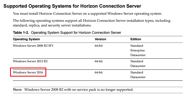 Note, in the above Hardware Requirements documentation, they didn’t update to include Windows Server 2016 which is now supported in Horizon View 7.1. Note in the Supported Operating Systems documentation, they show Windows Server 2016 in the list.
