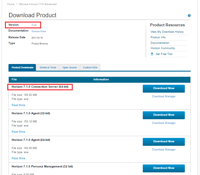 To obtain the binaries for installing Horizon 7.1.0 Connection Server, you will need to login to your VMware account portal and Browse out to the Horizon Download link. Note the version below is 7.1.0 and we want to first download the Horizon 7.1.0 Connection Server (64-bit) installation. As you can see also, the installation package is not that large – 183.52 MB.