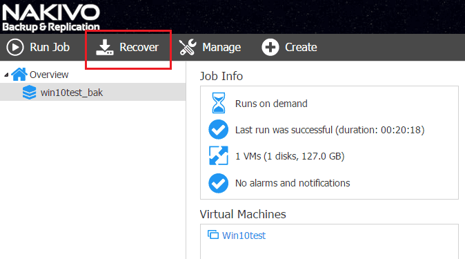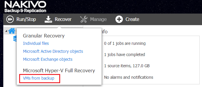 After getting a good backup of the VM from Hyper-V with Nakivo, chooseย Recover.
