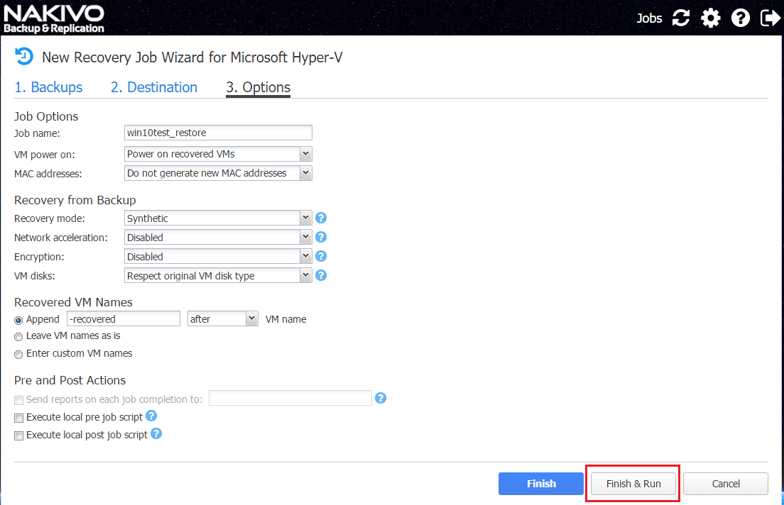 On theย Options screen, we can name the restore job, choose whether or not to power on the restored VM, change the MAC address, recovery mode, append to the name, pre and post actions, etc.
