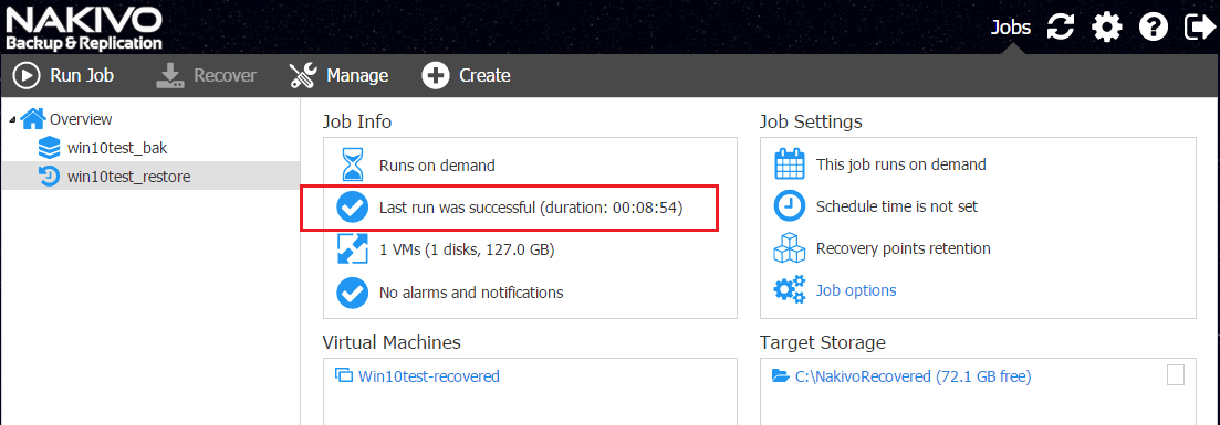 In a short while, the restoration of the full VM is finished along with the restore duration time displayed for us.