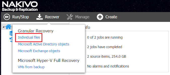We can also perform a file level restore for our Hyper-V VM. ย Selectย Recover >> Individual files to initiate the file recovery wizard.