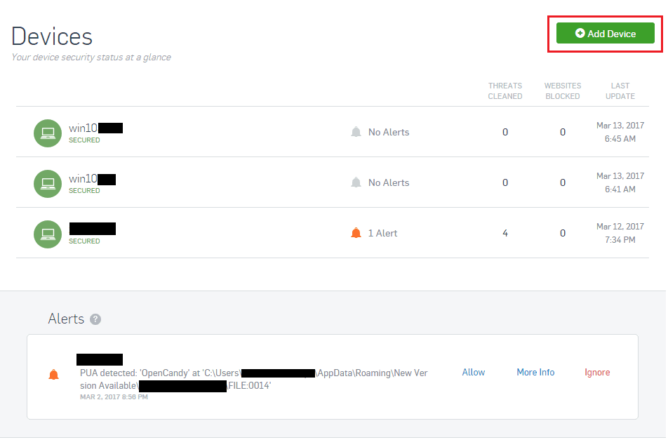 As you can see when you login to your console, you see a high level view in the Dashboard of all your machines you have added as well as any alerts that may be active. ย As you can see below, there is a machine with a Potentially Unwanted App or PUA that was found.