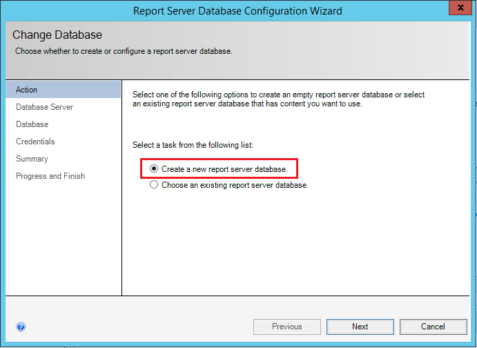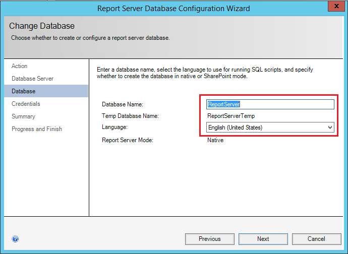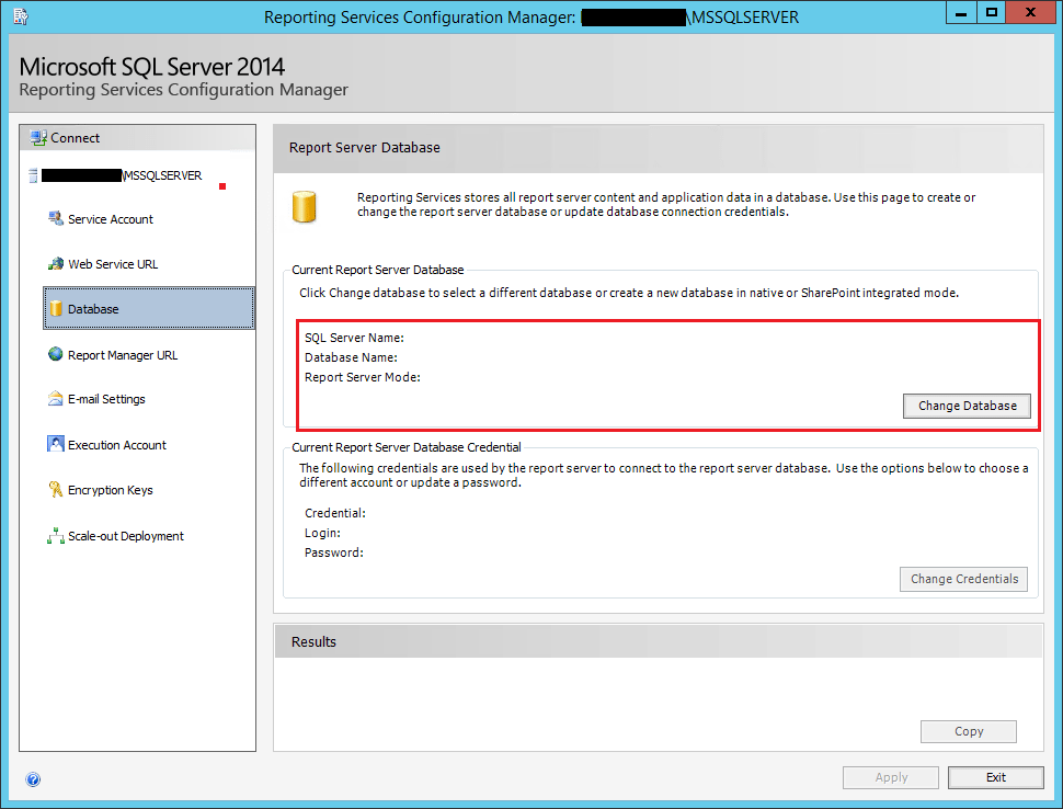 Click theย Databaseย configuration on the left. ย Notice how there is noย SQL Server Name,ย Database Name, orย Report Server Mode listed. ย Click theย Change Databaseย button.