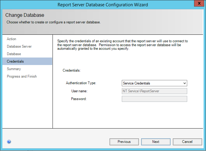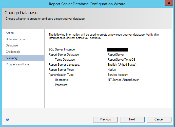 Now we can configure the Reporting Services database. ย Choose toย Create a new report server database.