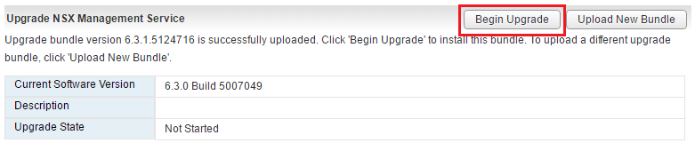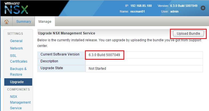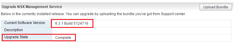 On theย Upgrade NSX Management Service screen, we can see theย current software version and also we see theย Upload Bundle button in the upper right hand corner.