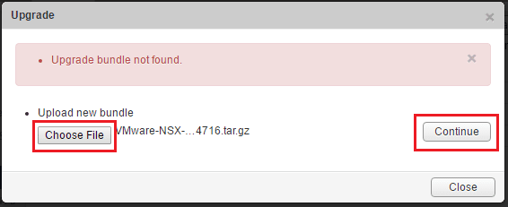 Once we initiate the Upload bundle operation, we are able toย Choose File and point to our upgrade package we have downloaded. ย Then clickย Continue.