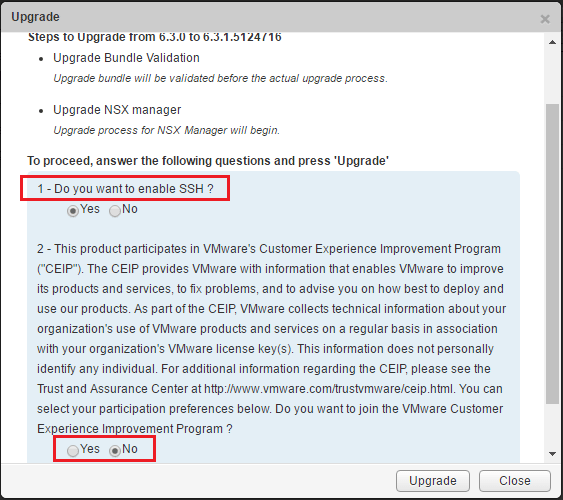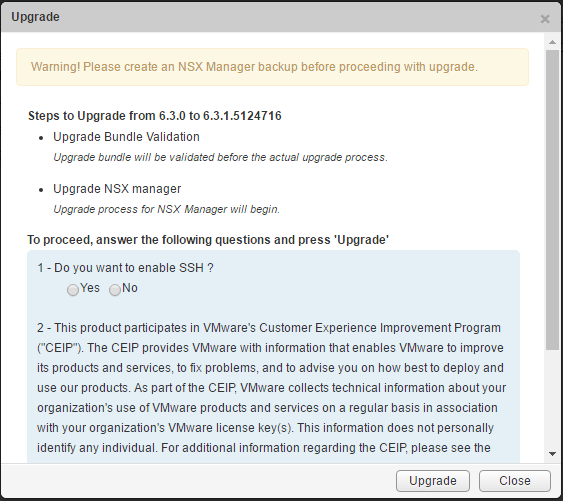 The Upgrader will provide some warning for us here as it will direct us to make a backup of the manager before proceeding with the upgrade. ย Notice we also have a couple of configurables here – whether or not to enable SSH and also to either agree or not agree to join the Customer Experience Improvement Program or CEIP.