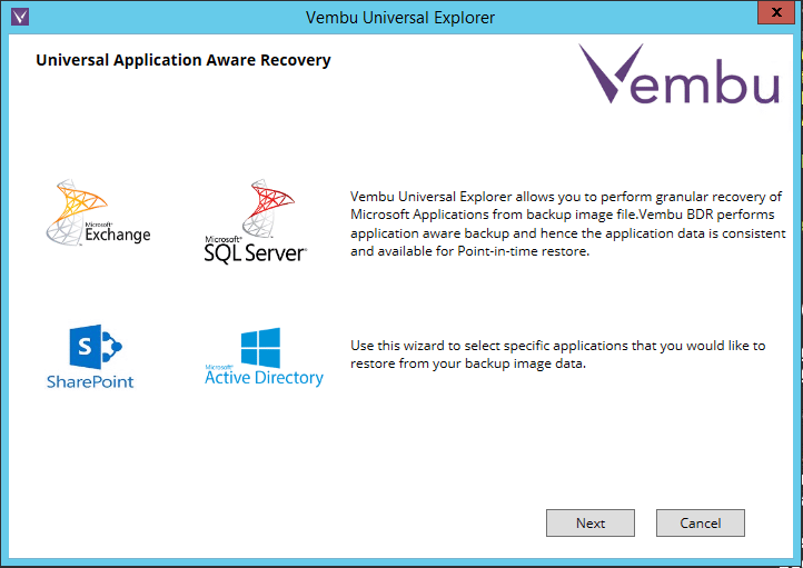 The tool that makes the application aware recovery of Vembu BDR Suite application aware backups possible is the Universal Application Aware Recovery utility.ย It allows the restoration of granular recovery of Microsoft Applications from backup image files.
