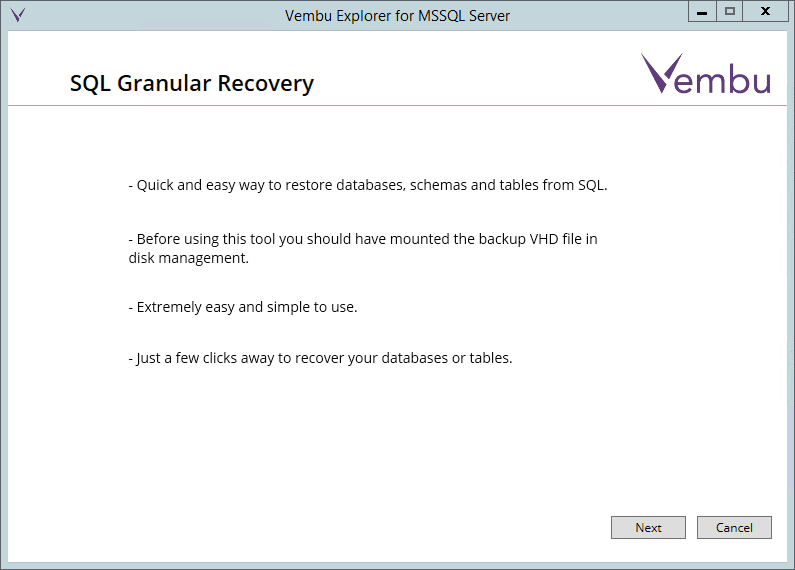 Vembu BDR Suite provides a powerful solution for capturing and restoring application aware backups.ย In the case of Microsoft SQL Server, having application aware backups are critical to make sure that transactional data is consistent.ย This ensures that all data in memory and pending I/O is successfully flushed and included in the backed-up data.ย Failing to utilize application aware settings with backups of Microsoft SQL Server and other products such as Microsoft Exchange can leave backups in an inconsistent state and possibly corrupted.ย The Vembu Universal Application Aware Recovery Utility makes the process to browse and restore application aware data extremely easy and efficient.