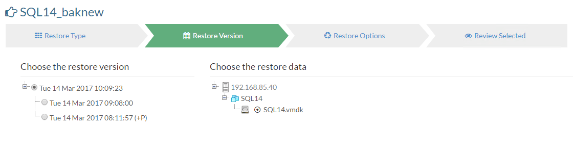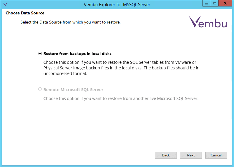 Here we select the data source.ย Since we are going to mount our backup restore point and restore from the mounted virtual drive, we select to Restore from backups in local disks.