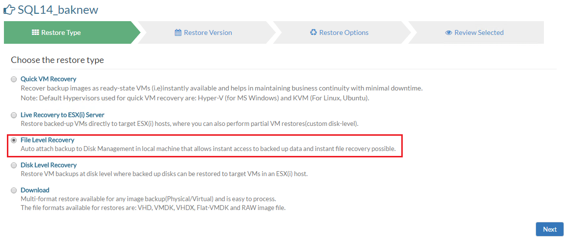 To see where we get the source of our backups as a local disk, letโs look at how to mount the virtual disk that we restore from.ย Go to Recovery and select to Restore the backup of the server you want to restore.ย Here we select File Level Recovery where the backup file is auto attached to our Vembu server so that we have instant access to the files contained therein.