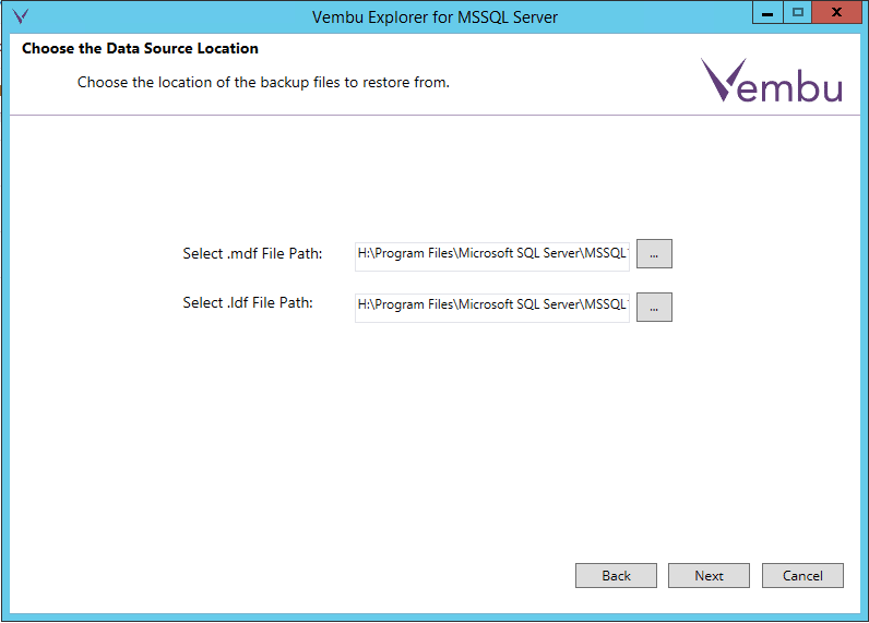 The next screen in our Vembu Explorer for MSSQL Server is to actually choose the .mdf and .ldf files from our mounted virtual disk.