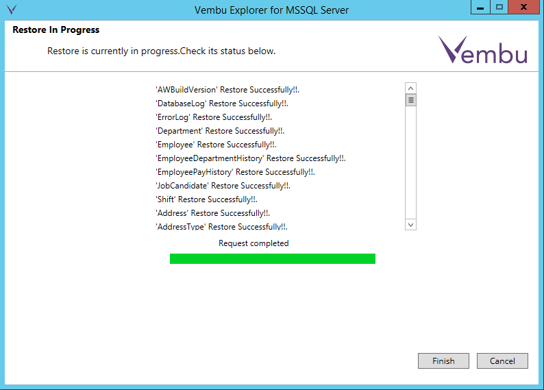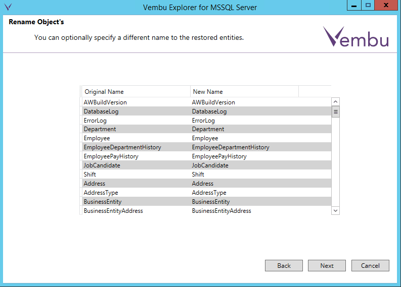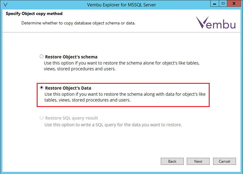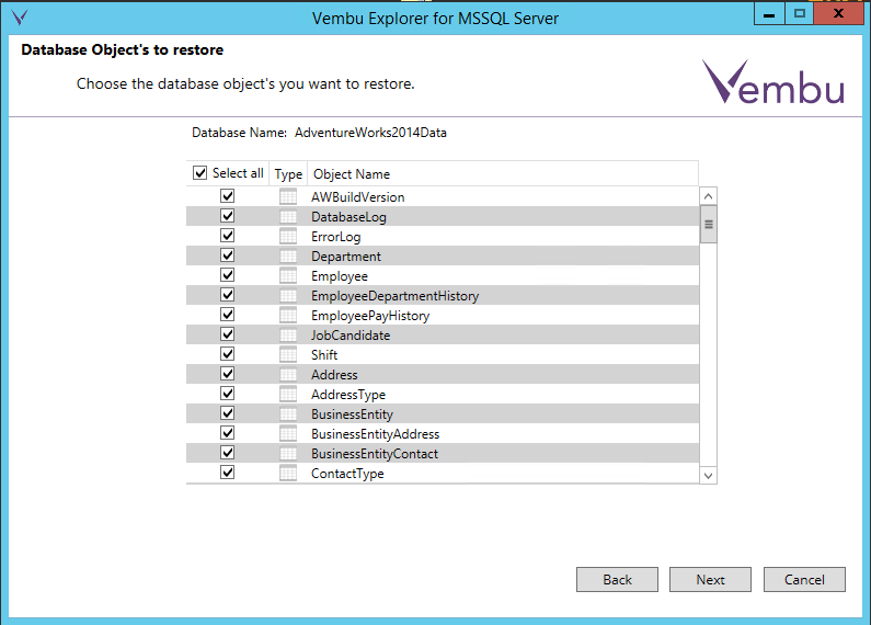 The application aware processing in the Vembu Explorer will read the database files in the backup and present the restorable objects to you in the interface.ย You can pick and choose here what you want to restore as well.