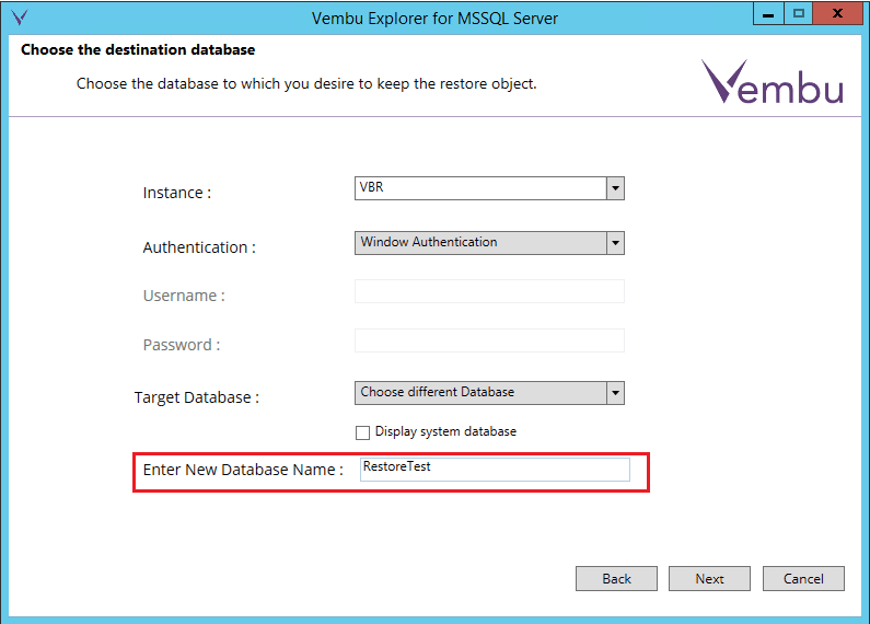 Enter the database restore options you want here in connecting to your local Vembu DB server.ย We can select how to authenticate, as well as if we want to restore to an existing database or create a new database.
